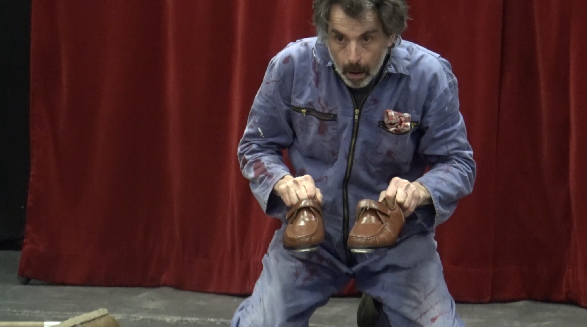 Un machino de théâtre passe le balai sur le plateau. D’autres agents de nettoyage passent par là…